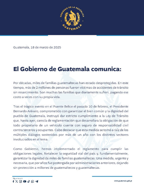 El Gobierno de Guatemala emitió un comunicado oficial donde se pronunció sobre los bloqueos liderados por motoristas y taxistas en la Ciudad de Guatemala, quienes rechazan el pago del seguro obligatorio contra terceros.