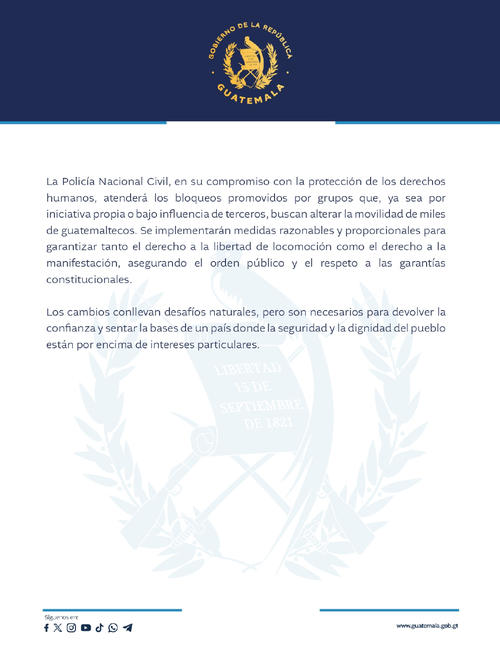 Según detalló el Gobierno en el comunicado, la Policía Nacional Civil (PNC) garantizará la protección de los derechos humanos y atenderá la situación de los bloqueos.