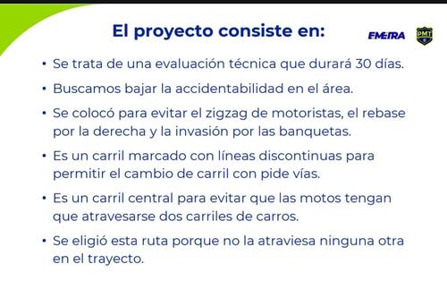 Se trata de un carril exclusivo para motoristas incorporado desde el fin de semana pasado. Esto, con el fin de reducir accidentes y otras maniobras de alto riesgo entre quienes conducen motocicletas.