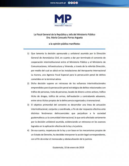 "Lamento la decisión apresurada y unilateral de la DGAC en cuanto a dar por terminado el convenio de cooperación interinstitucional entre el MP y el Ministerio de Comunicaciones", refiere un comunicado del MP.