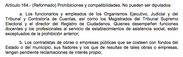 La Constitución Política de la República, en su artículo 164, establece que una de las prohibiciones para ser diputado es ser contratista del Estado, lo cual habría impedido que Velásquez asumiera el cargo.