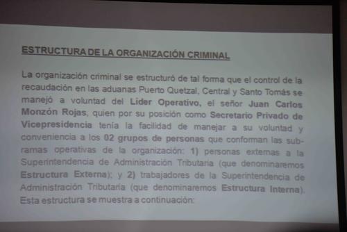 Mientras hacía referencia a la nueva evidencia, se recordó en una presentación que Juan Carlos Monzón, el exsecretario privado de Baldetti, era el líder operativo. “Por su posición como secretario privado de Vicepresidencia, tenía la facilidad de manejar a su voluntad y conveniencia a los dos grupos”.