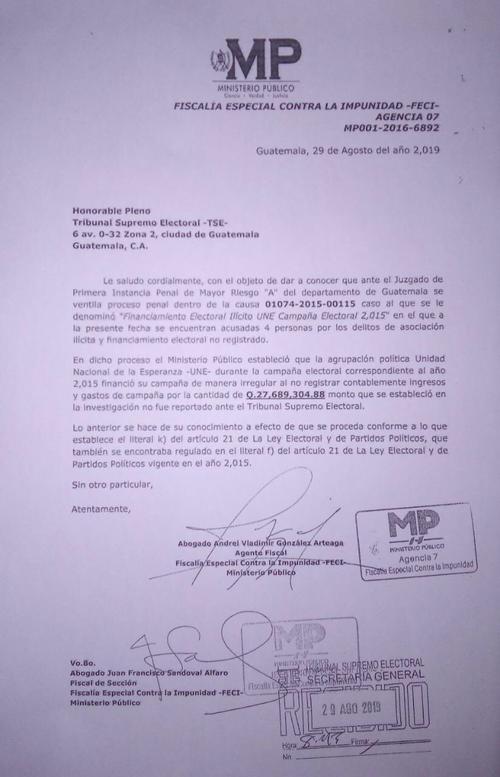 Al no haber sido reportado al TSE dicha recepción de se incurrió en delitos antes mencionados. Por ello, el MP solicita que la organización política sea cancelada aplicándose la literal "k" del Artículo 21 de la Ley Electoral y de Partidos Políticos.