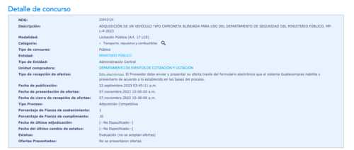 Aunque el concurso se publicó en septiembre, este fue requerido el 15 de mayo de 2023. La última fecha para que empresas ofertaran fue el 7 de noviembre, pero el MP no recibió ofertas.