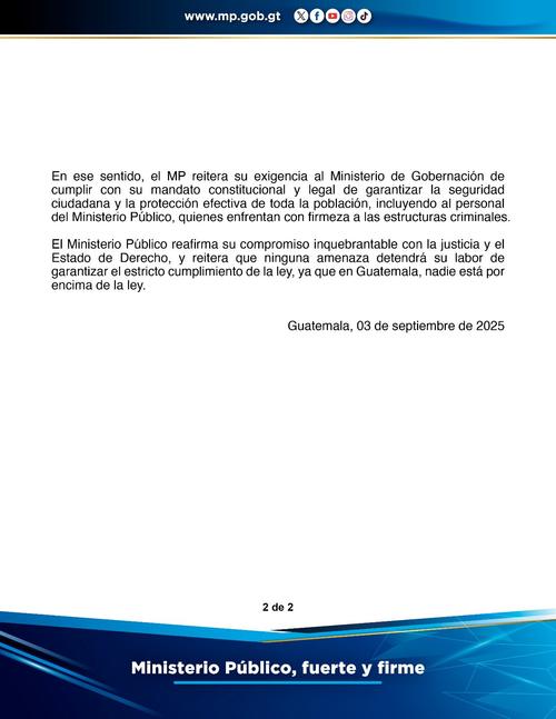 Además, el MP responsabilizó al Ejecutivo de brindar seguridad y exigió al Ministerio de Gobernación que garantice la seguridad del personal expuesto al riesgo por enfrentar a estructuras criminales de alto poder.