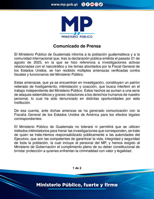 "Estas amenazas que se encuentran en investigación, constituyen un patrón reiterado de hostigamiento, intimidación y coacción, que busca interferir en el trabajo independiente del Ministerio Público", dice parte del comunicado.
