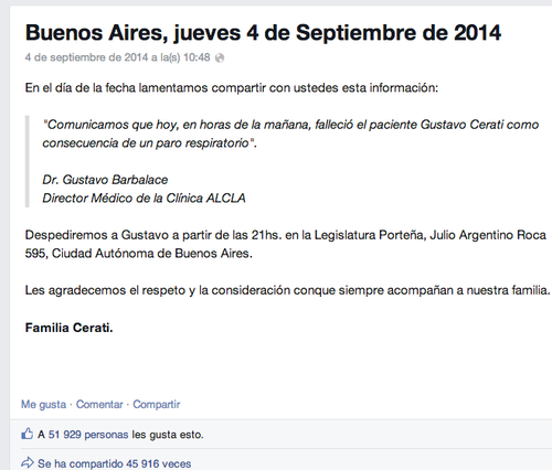 Medios internacionales dan a conocer la muerte del músico, cantautor, compositor y productor discográfico argentino Gustavo Cerati, quien luego de un accidente cerebro vascular que tuvo en mayo de 2010, falleció a sus 55 años.