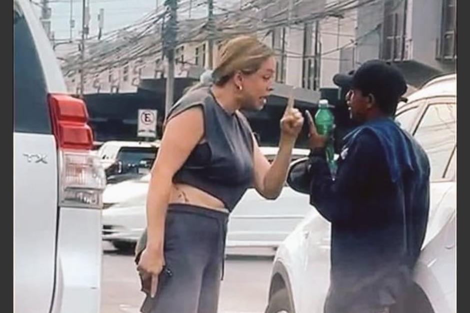El individuo, un limpiavidrios, se ve sorprendido por la actitud de la mujer que con un arma en mano, pero sin apuntarle, discute con él mientras otros automovilistas captan el suceso.