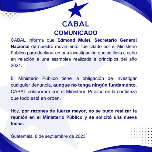 "El Ministerio Público (MP) tiene la obligación de investigar cualquier denuncia, aunque no tenga ningún fundamento", reza un comunicado emitido este viernes 8 de septiembre por el partido político Cabal.