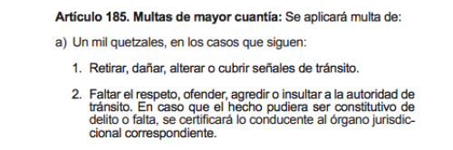 Esto generó una multa de 200 quetzales, amparada en el artículo 181 de la Ley de Tránsito. La sanción molestó al conductor, quien insultó, agredió y amenazó de muerte al agente de la PMT.