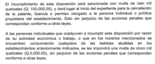 El incumplir esta medida trae consigo multas que van desde los 5 mil quetzales para una persona individual y hasta 100 mil quetzales para los comercios, locales, bares o tiendas que vendan licor pasada la 1:00 horas.