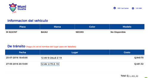 La primera de ellas corresponde al 25/07/2016 en la 12 avenida y 6ta. calle de la zona 19 y fue impuesta por circular sin portar tarjeta de circulación o fotocopia de autenticidad de la misma. Así como por circular en contra de la vía señalada o autorizada.