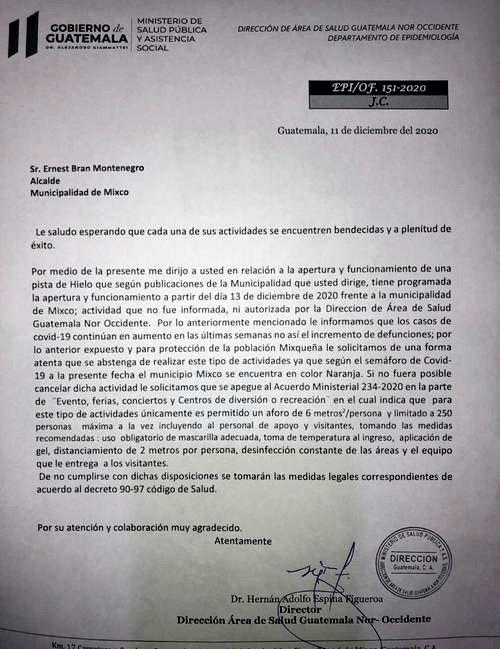 Por su parte el Ministerio de Salud envió una nota al alcalde de Mixco, Neto Bran, para solicitar que se abstenga de realizar este tipo de actividades.