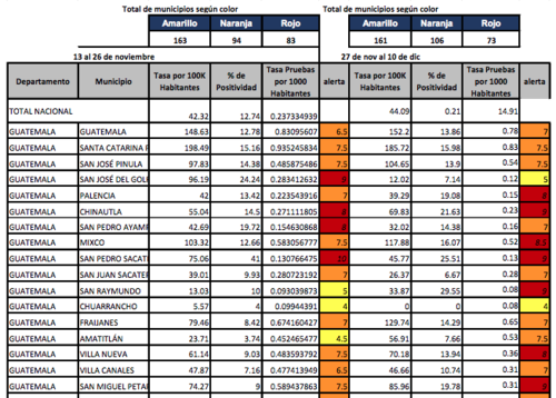 El municipio de Mixco, según la última actualización del tablero de alertas del Ministerio de Salud, se encuentra en color rojo, es decir un nivel de contagio de 117 por cada 100 mil habitantes.