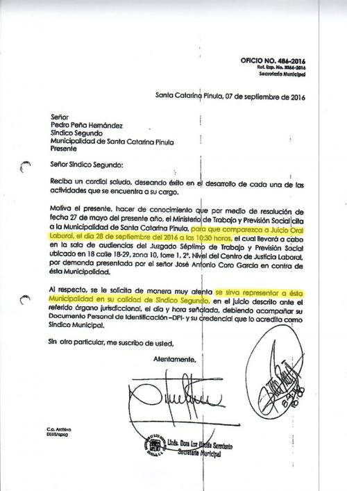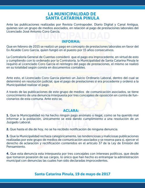 La Municipalidad de Santa Catarina Pinula publicó un comunicado para aclarar el pago de 3 millones 459 mil 901 quetzales por concepto de indemnización al exalcalde Antonio Coro.