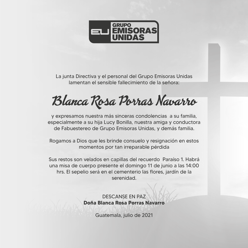 Profesionales de la comunicación y la música enviaron sus condolencias, por el deceso de la señora Blanca Porras, a la locutora de la emisora radial Fabuestero, Lucy Bonilla, su hija.