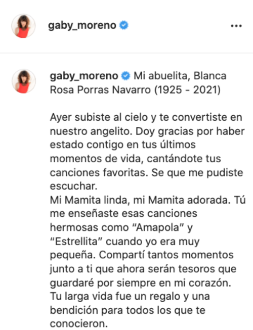 A través de un emotivo video y fotografías, Gaby Moreno recordó el legado que Blanca Rosa dejó como pilar de su familia: