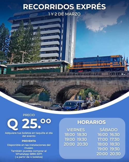 El recorrido express se realizará el 1 y 2 de marzo, tiene un costo de Q25.00, puedes conseguirlo en taquilla el día del evento o en preventa. También puedes comprarlo por WhatsApp al 5890-3371 a partir de 4 boletos.