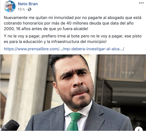 Luego de conocer el fallo de la CC la reacción del polémico alcalde no tardó. En su cuenta de Facebook, Bran aseguró: "Nuevamente me quitan mi inmunidad por no pagarle al abogado que está cobrando por más de 40 millones (de quetzales) deuda que data del año 2000, 16 años antes de que yo fuera alcalde".