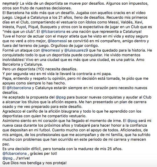 "La vida de un deportista se mueve por desafíos. Algunos son impuestos, otros son fruto de nuestras decisiones. El Barcelona ha sido más que un desafío. Jugaba con aquellos cracks en el videojuego. Llegué a Cataluña a los 21 años, lleno de desafíos. Recuerdo mis primeros días en el Club, compartiendo el vestuario con ídolos como Messi, Valdés, Xavi, Iniesta, Puyol, Piqué, Busquets y otros con la expectativa de jugar en un Club que es “més que un club”. El @fcbarcelona es una nación que representa a Cataluña!", explica "Ney".