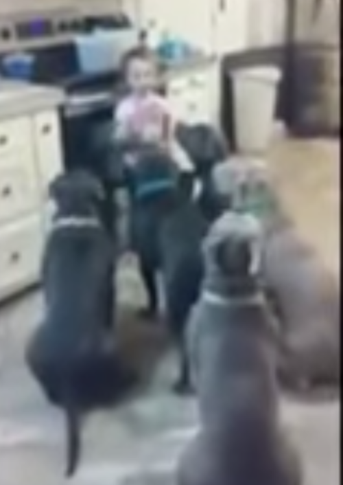 Pese a su mala reputación, esta familia de seis pitbulls obedecen a una niña de 4 años, quien en control total de la situación les da órdenes para que permanezcan sentados, hasta que ella les indica que pueden comer.