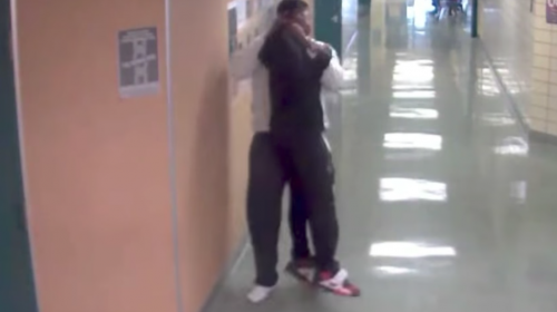 Según muestran las imágenes que grabaron el momento, el niño estaba parado frente a una colchoneta en el gimnasio de la escuela mientras la profesora que estaba a un costado, le indicaba con una vara lo que debía hacer.
