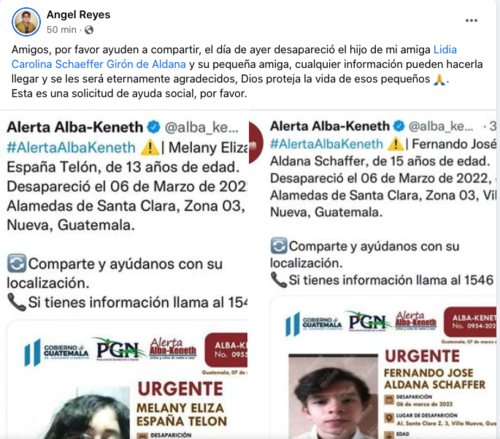 La información refiere que Melany Eliza España Telón de 13 años y su amigo del condominio Fernando José Aldana Schaffer de 15 años desaparecieron este domingo 6 de marzo en las garitas del condominio ubicado en la zona 3 de Villa Nueva.