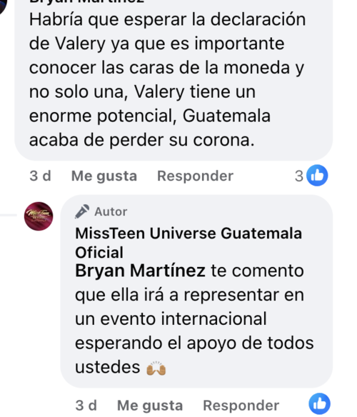 A través de redes sociales, Miss Teen Universe Guatemala emitió un comunicado en el que dan a conocer que la actual representante nacional, Valery Dayanna Contreras, no podrá participar en el certamen internacional en su edición 2024.