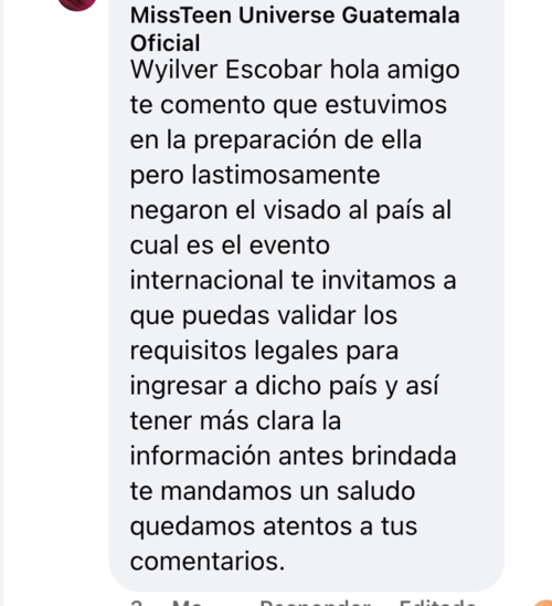 Y es que de acuerdo con la organización, a la joven guatemalteca le negaron la visa que le permitiría viajar a Sudáfrica, donde se celebrará el evento de belleza en noviembre próximo.