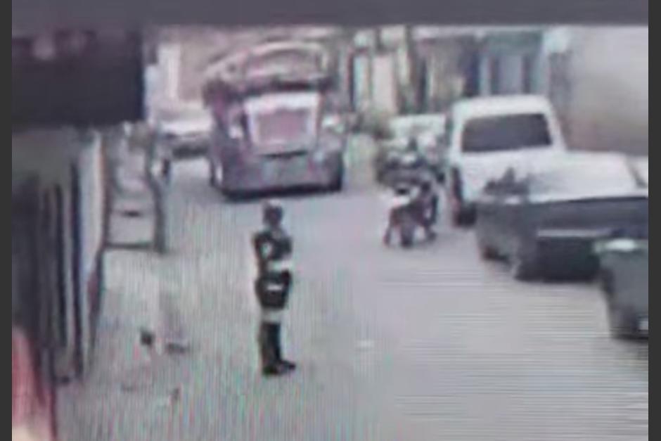 En el municipio de San Raymundo, Guatemala, aproximadamente a las 17:08 horas, una cámara de vigilancia logró captar el momento en el que un bus atropella a un agente de la policía.