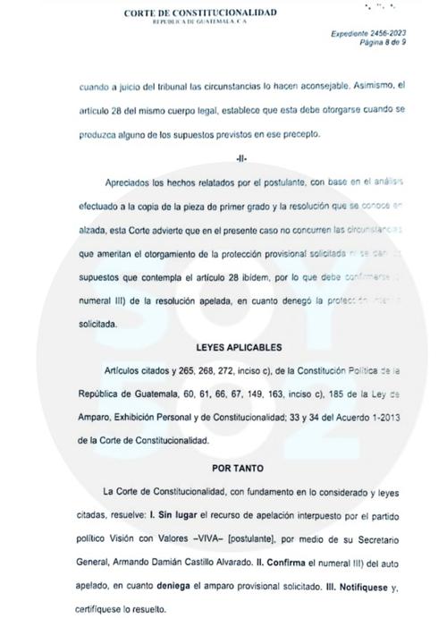 La Corte de Constitucionalidad (CC) negó el recurso de apelación presentado por el partido Visión con Valores (VIVA), con el que pretendían que se negara el amparo provisional otorgado por la Corte Suprema de Justicia (CSJ) que le negó la inscripción como candidato a diputado al expresidente Alfonso Portillo.