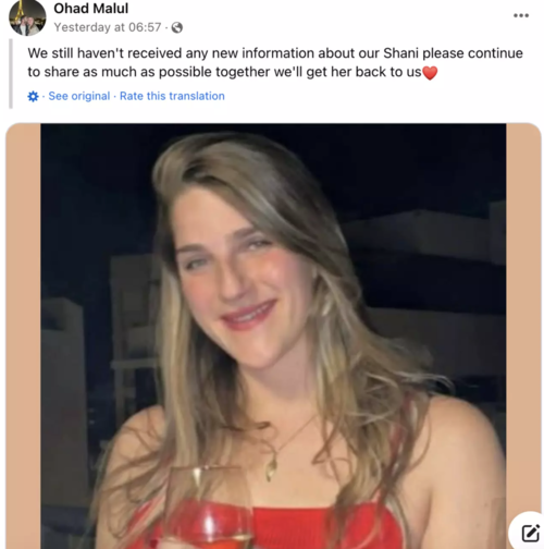 Entre ellos se encuentra Shani Kupervaser, quien asistió al evento musical, pero ya no retornó a casa y sus seres queridos desconocen su paradero. Su novio, Ohad Malul, rompió el silencio y dijo estar "en agonía" por una decisión que tomó.