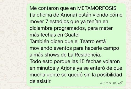 "Me contaron que en METAMORFOSIS (la oficina de Arjona) que están viendo cómo mover 7 estadios que ya tenían en diciembre programados para meter más fechas en Guate!", inicia el mensaje, afirmando además que el Teatro Nacional está haciendo lo posible por ceder más espacios.