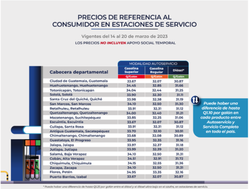 Estos son los precios de referencia por galón de los combustibles vigentes hasta el 20 de marzo, en modalidad de autoservicio. En las gasolineras de la ciudad capital, aún se mantienen los precios de referencia de la semana anterior: