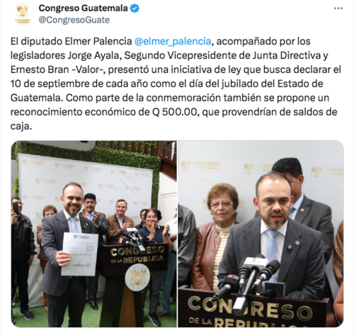 Establecer el 10 de septiembre como día del jubilado del Estado de Guatemala y brindar un nuevo aporte económico a ese sector es el objetivo de una iniciativa de ley que se impulsa en el Congreso de la República.