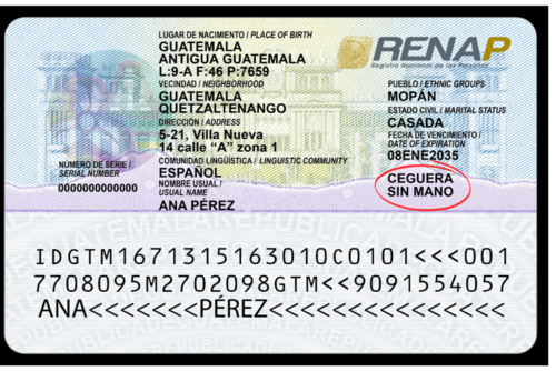 Según la infografía proporcionada por las autoridades del RENAP, este detalle se refleja con términos cómo: "Ceguera" o "Sin mano".