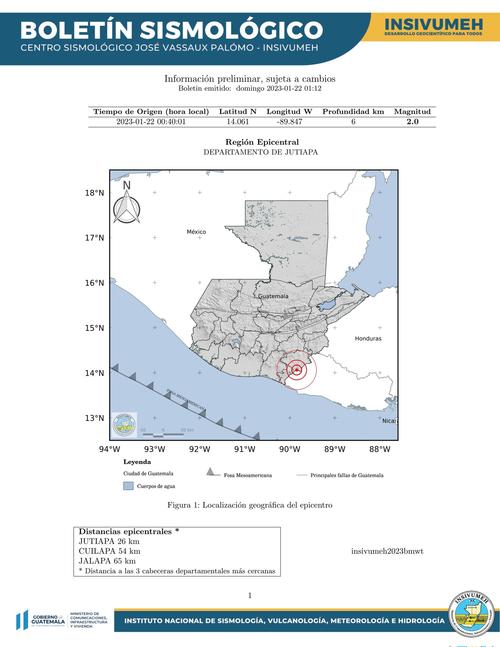 Durante la madrugada de este 22 de enero un temblor de magnitud 2.0 grados se produjo a la 1:12 horas, informó el Instituto Nacional de Sismología, Vulcanología, Meteorología e Hidrología (Insivumeh).