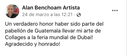 "Un verdadero honor haber sido parte del pabellón de Guatemala y llevar mi arte de Collages a la feria mundial de Dubai! Agradecido y honrado", escribió.