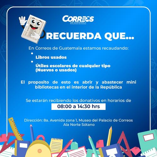La oficina de Correos de Guatemala estará recaudando, durante enero, los libros usados y útiles escolares nuevos o usados.