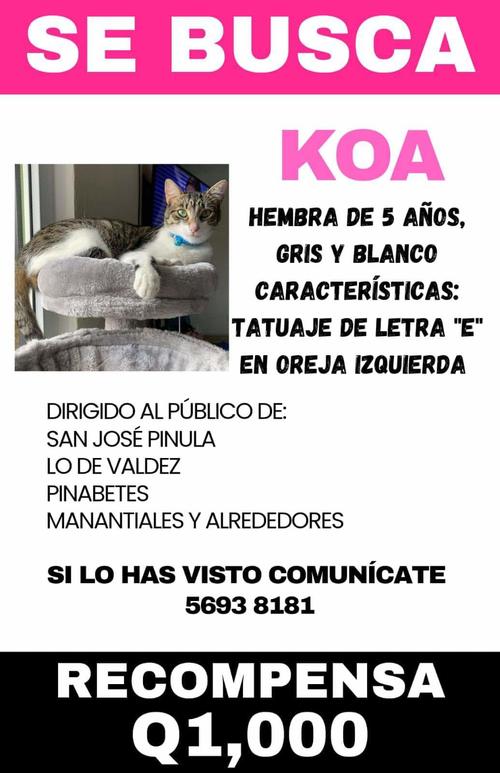 La guatemalteca ofrece Q1,000 de recompensa a quien encuentre a Koa, y pide que se comuniquen al número: 5693-8181.
