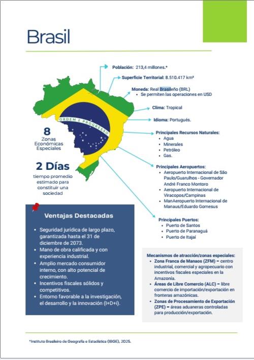 Aunque Brasil, solo tiene 8 Zonas Francas con 523 empresas, el gigante de América posee una población de 213.4 millones y una extensión territorial de 8.510.417 km² que lo hacen relevante por la magnitud de sus operaciones.