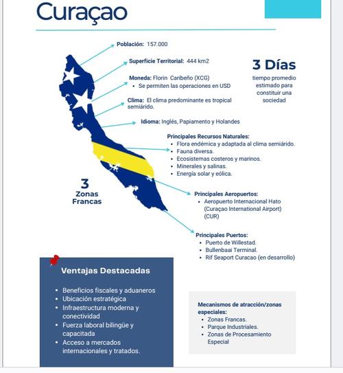 Este pequeño del Caribe, con apenas 157 mil habitantes y una extensión territorial de 444 km2, tiene 3 Zonas Francas, posee 130 empresas dentro de sus recintos aduaneros. Curacao es una economía insular altamente abierta, reconocida por su estabilidad política, su entorno favorable para los negocios y su posición estratégica en el Caribe; y además, cercana a las principales rutas marítimas y aéreas de América y Europa.