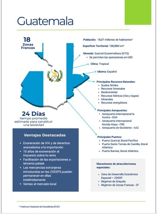 Catalogada como el centro de las Américas, Guatemala constituye la puerta natural entre los mercados norteamericano y sudamericano. En sus 108,888 km2 el país cuenta con 18 Zonas Francas que resguardan a 96 empresas. De igual manera el país combina estabilidad macroeconómica, destaca entre sus 18.07 millones de habitantes una fuerza laboral joven y una creciente infraestructura productiva que impulsa la inversión y el comercio internacional.