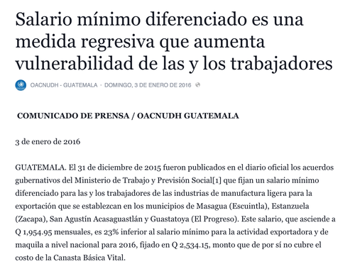La Oficina del Alto Comisionado de la ONU para Derechos Humanos emitió un comunicado donde se critica la decisión del Gobierno de Guatemala de decretar salarios mínimos diferenciados para cuatro municipios del país por considerar que es “una medida regresiva que incrementa la situación de vulnerabilidad de los trabajadores y sus familias“.