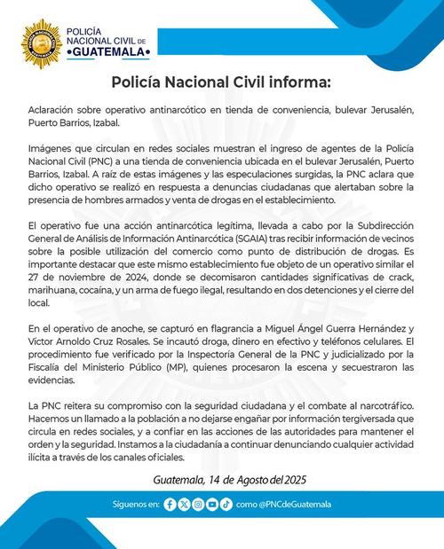 Horas después de que las imágenes se hicieran virales y fueran duramente criticados por la forma de operar, la Policía Nacional Civil (PCN) lanzó un comunicado para aclarar el hecho.
