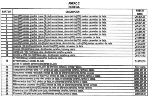 En una publicación del Diario de Centro América, el Organismo Judicial convocó a una subasta pública de varios lotes de piezas de jade, algunas valoradas desde los Q15 mil y otras hasta los Q176 mil.