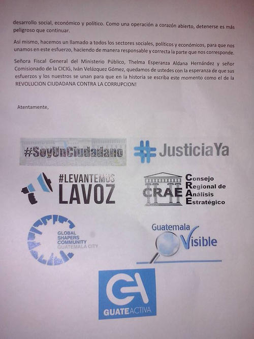 A través de una carta firmada por los movimientos, también se mostró un repudio a las acciones que los funcionarios y políticos que se han visto involucrados en las investigaciones, han emprendido en contra del titular de la CICIG, Iván Velásquez, y la Fiscal General, Thelma Aldana.