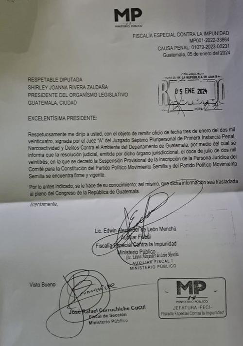 Por tercera ocasión, la Fiscalía Especial Contra la Impunidad (FECI) notificó al Congreso de la República que el partido Movimiento Semilla está suspendido por orden judicial.