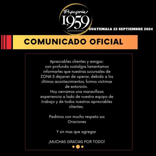 "Apreciables clientes y amigos: con profunda nostalgia lamentamos informarles que nuestras sucursales de zona 5 dejarán de operar, debido a los últimos acontecimientos, fuimos víctimas de extorsión", reza el comunicado.