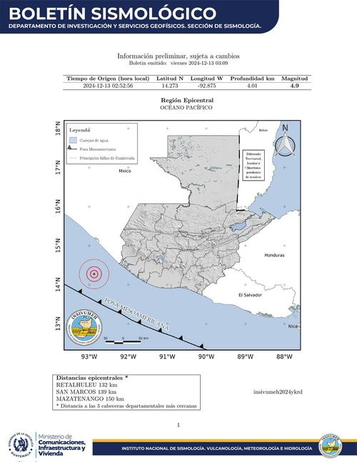 El miércoles 11 de diciembre, el temblor fue de magnitud 4.8 con epicentro en el Océano-Pacífico y sensible en varias regiones de Guatemala.